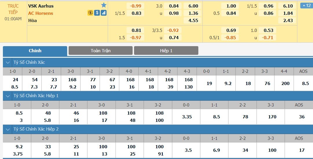 Tỷ lệ kèo cá cược bóng đá trận VSK Aarhus vs AC Horsens