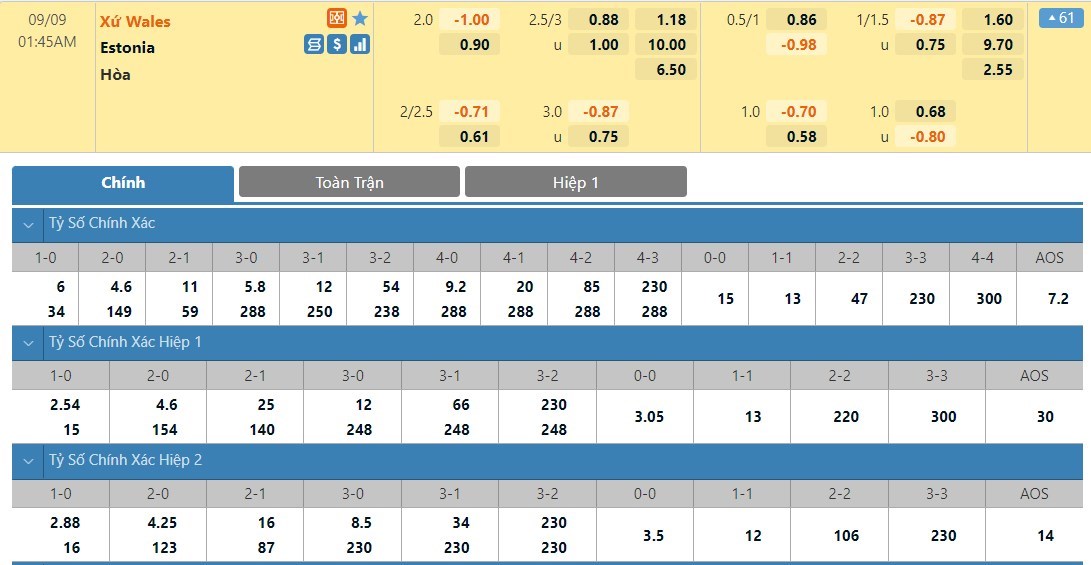 Tỷ lệ kèo cá cược bóng đá trận Wales vs Estonia