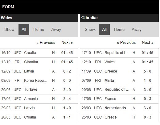 Xem tỷ lệ kèo cá cược bóng đá trực tuyến Wales vs Gibraltar