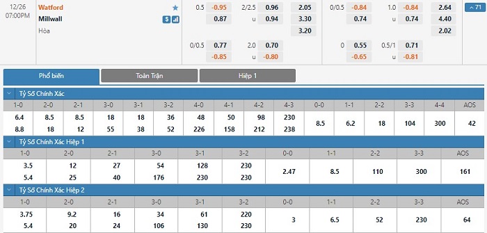 Tỷ lệ kèo cá cược bóng đá trận Watford vs Millwall