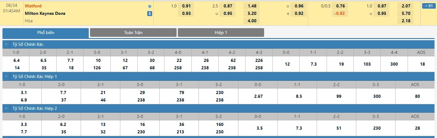 Tỷ lệ kèo cá cược bóng đá trận Watford vs Milton Keynes Dons