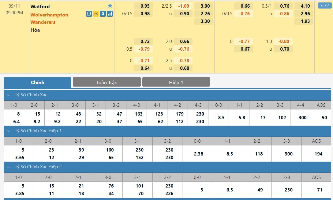 Có thể thấy cả chủ nhà lẫn đội khách đều đang có phong độ không tốt trước khi đến với cuộc đối đầu này. Tuy nhiên để so sánh thì rõ ràng là Watford vẫn đang làm tốt hơn đôi chút. Trong khi đó ở kèo châu Á tỷ lệ mà nhà cái đưa ra lại là Wolverhampton chấp 0.25. Với tỷ lệ này thì chắc chắn Watford sẽ là lựa chọn an toàn hơn cho người chơi.