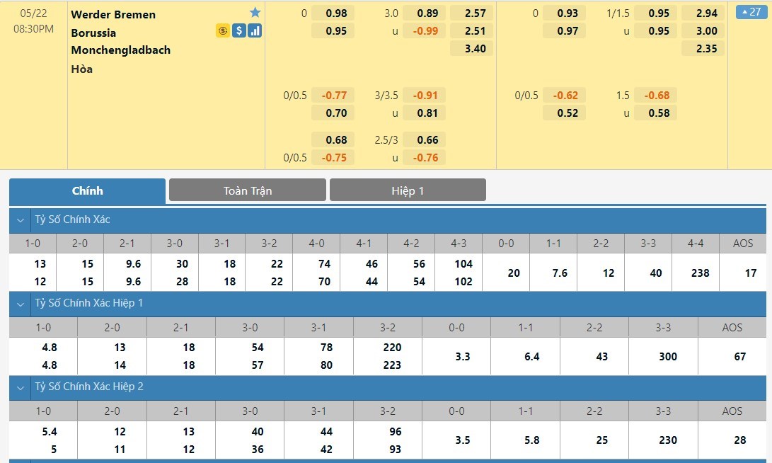 Tỷ lệ kèo cá cược bóng đá trực tuyến trận Werder Bremen vs Borussia M.Gladbach