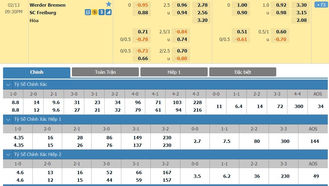 Tỷ lệ kèo cá cược bóng đá trận Werder Bremen vs Freiburg