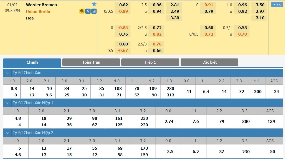 Tỷ lệ kèo cá cược bóng đá trực tuyến trận Werder Bremen vs Union Berlin