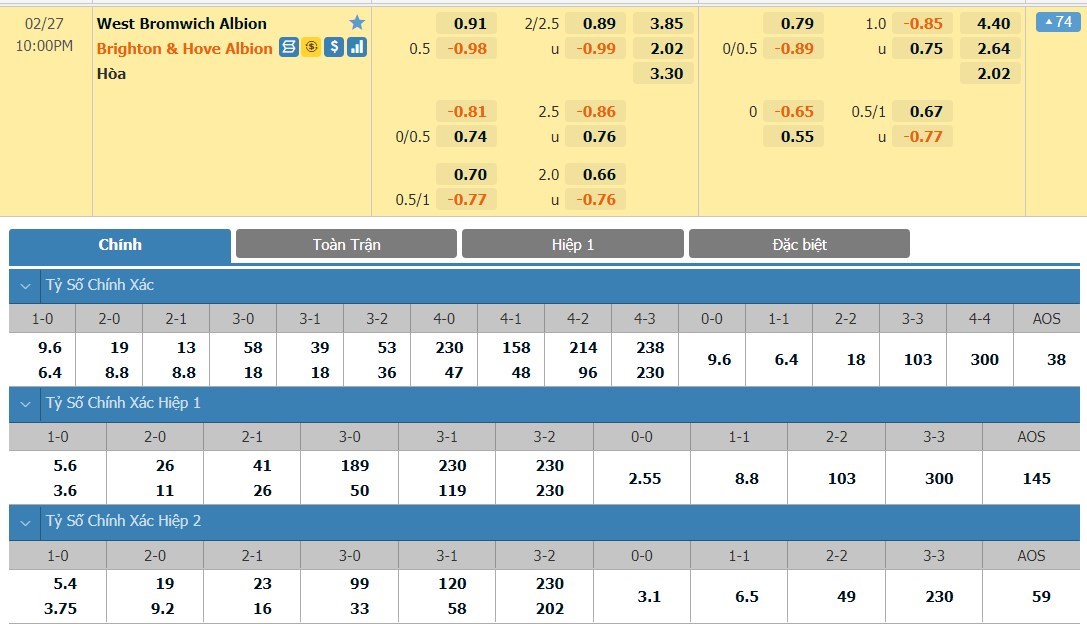 Xem tỷ lệ kèo cá cược bóng đá trực tuyến West Brom vs Brighton