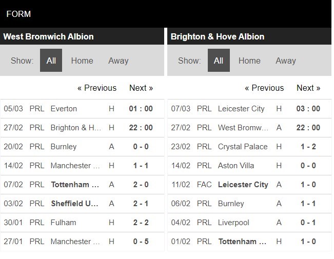 Chu kỳ lên xuống tỷ lệ kèo West Brom vs Brighton