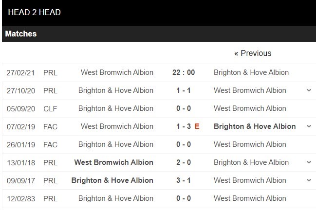 Cả 5 cuộc chạm trán gần đây nhất diễn ra giữa 2 đội đã kết thúc mà không có trận nào xuất hiện quá 2 bàn. 4 trận đấu trước đó trên mọi đấu trường, West Brom và Brighton cùng chỉ có 2 bàn thắng mà thôi. Vì thế, 90 phút tới dễ sẽ là 1 kết quả xỉu.