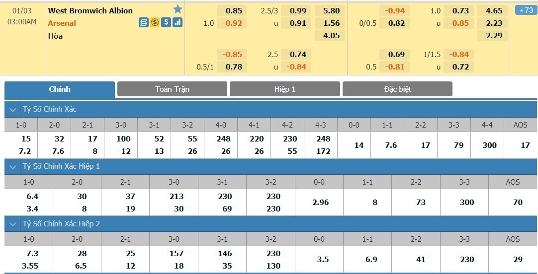 Tỷ lệ kèo cá cược bóng đá trận West Bromwich vs Arsenal