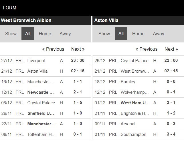 Thống kê phong độ West Bromwich vs Aston Villa
