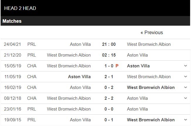 Thống kê đối đầu West Bromwich vs Aston Villa