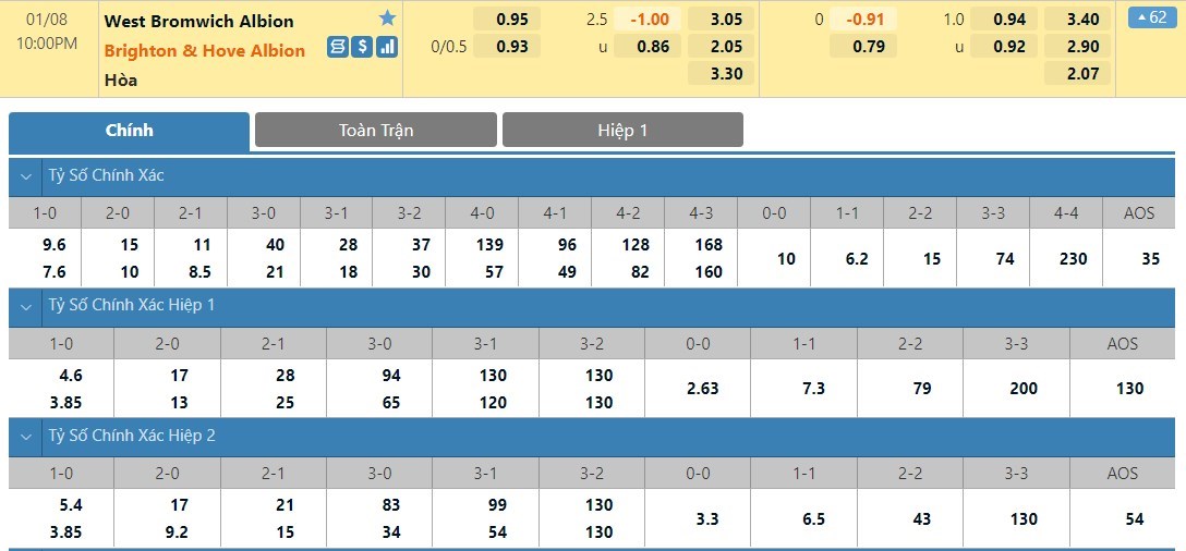 Tỷ lệ kèo cá cược bóng đá trận West Bromwich vs Brighton