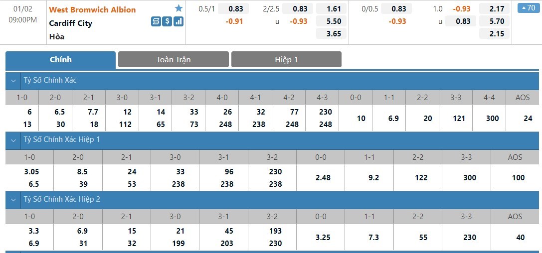 Tỷ lệ kèo cá cược bóng đá trận West Bromwich vs Cardiff