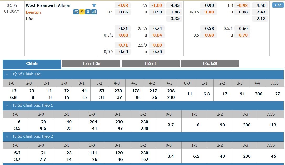 Xem tỷ lệ kèo cá cược bóng đá trực tuyến West Bromwich vs Everton