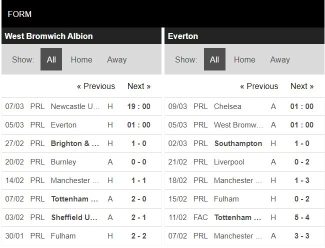 Thống kê phong độ West Bromwich vs Everton