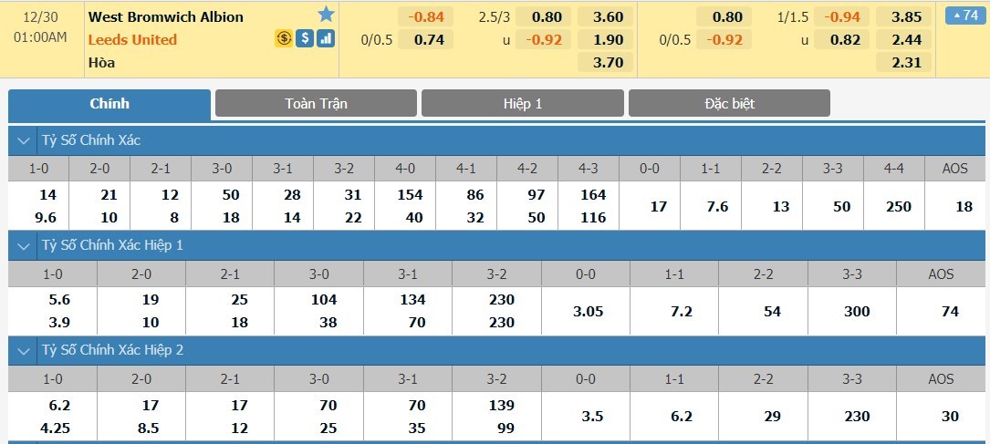 Tỷ lệ kèo cá cược bóng đá trực tuyến trận West Bromwich vs Leeds United