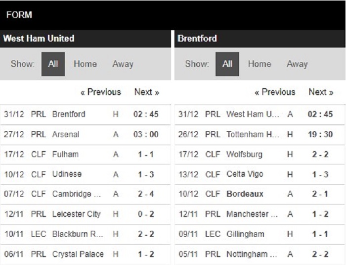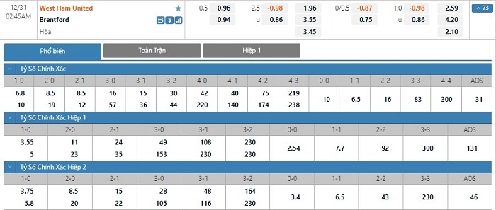 Chu kỳ lên xuống tỷ lệ kèo West Ham vs Brentford