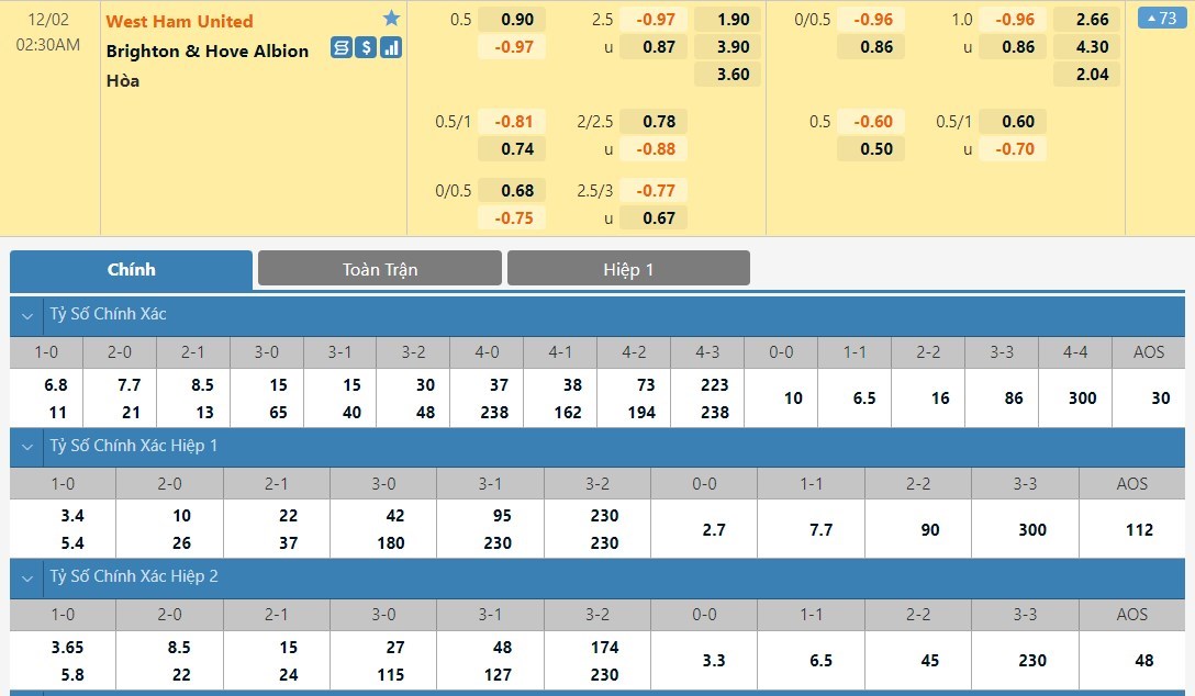 Tỷ lệ kèo cá cược bóng đá trận West Ham vs Brighton