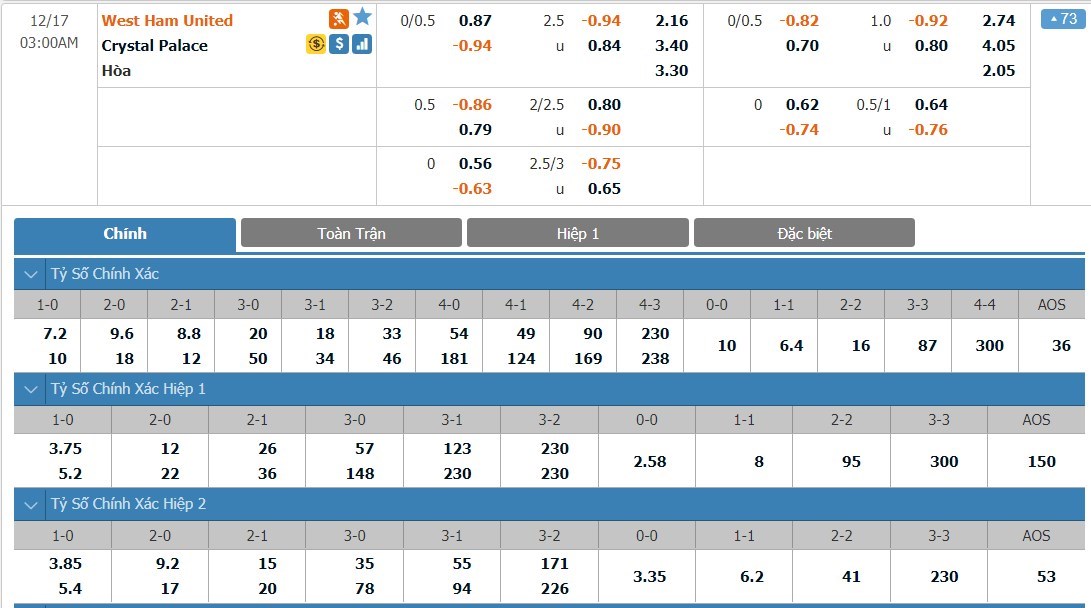 Tỷ lệ kèo cá cược bóng đá trực tuyến trận West Ham vs Crystal Palace