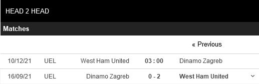 Lần gần nhất 2 đội gặp nhau là ở trận lượt đi khi West Ham thắng 2-0 nhờ những pha lập công của Michail Antonio và Declan Rice. Vì vậy, Dinamo Zagreb cần một màn trình diễn cải thiện hơn nếu như muốn tiếp tục được chơi ở Europa League mùa này.