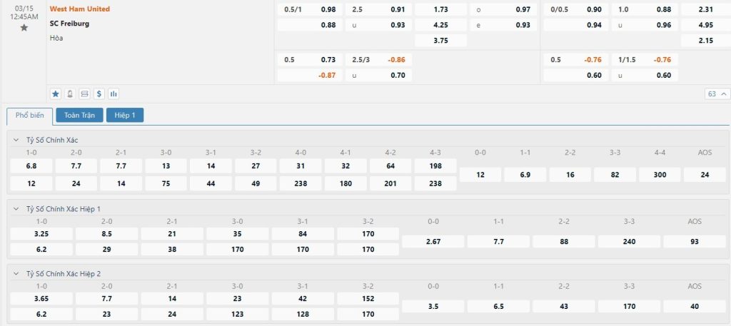 Tỷ lệ kèo cá cược bóng đá trực tuyến trận West Ham vs Freiburg