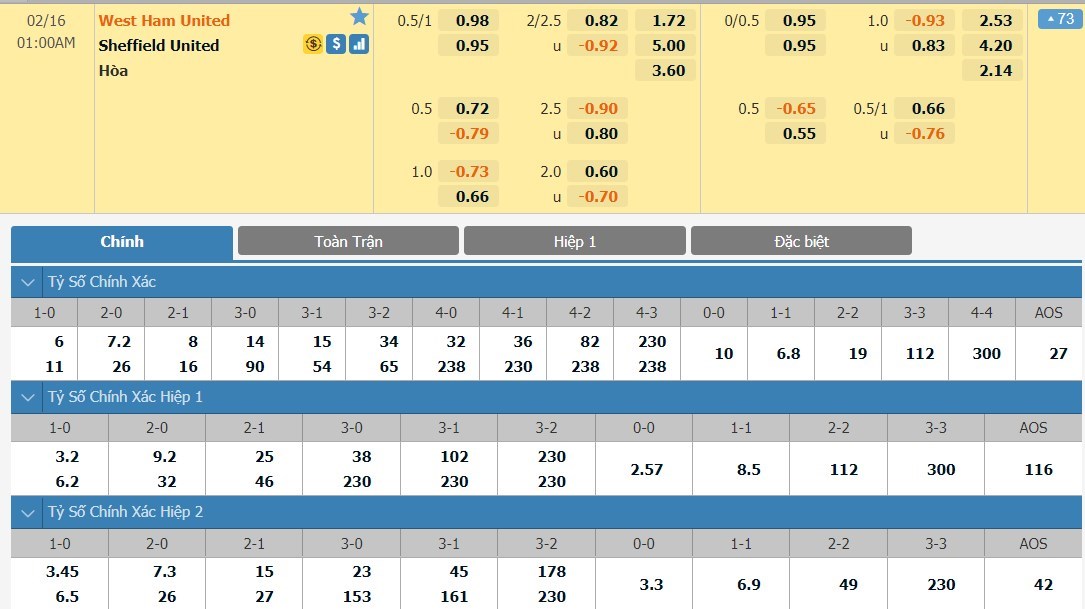 Xem tỷ lệ kèo cá cược bóng đá trực tuyến West Ham vs Sheffield United