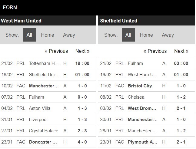 West Ham sẽ trở lại sân nhà của mình để có cuộc tiếp đón đối thủ Sheffield United trong khuôn khổ vòng 24 của giải Ngoại hạng Anh năm nay. West Ham với việc để thua bàn duy nhất ở hiệp 2 đã thất bại Manchester United ở trận đấu tại FA Cup vừa qua. Ở Premier League, The Hammer đang thể hiện khá tốt khi mà có 3 thắng trong 5 vòng gần nhất. Họ leo lên hạng 6 trên BXH khi có 39 điểm. Dù đội khách vẫn đang khá chật vật ở nhóm cuối bảng, nhưng chính tâm lý không còn đường lùi sẽ biến họ trở thành một chướng ngại thực sự đối với The Hammer.