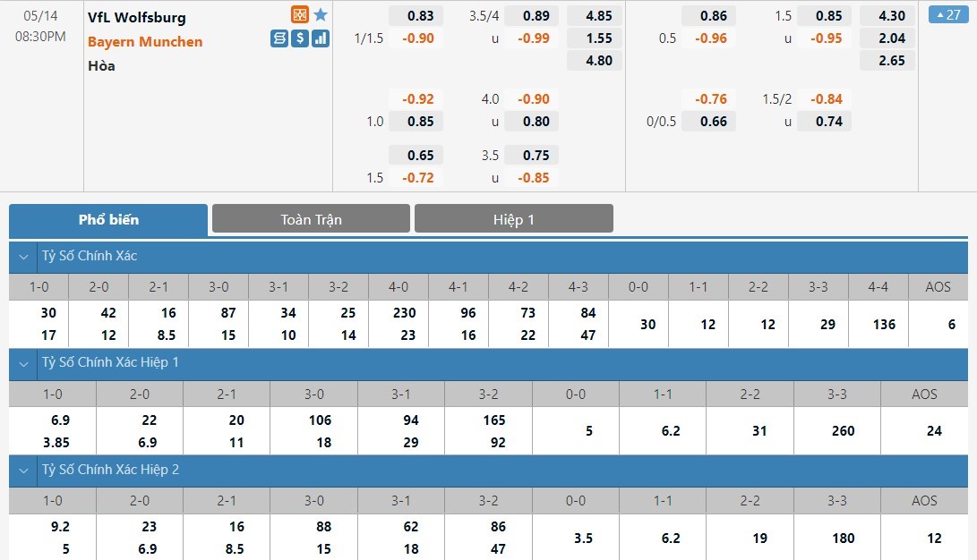 Tỷ lệ kèo cá cược bóng đá trực tuyến trận Wolfsburg vs Bayern Munich