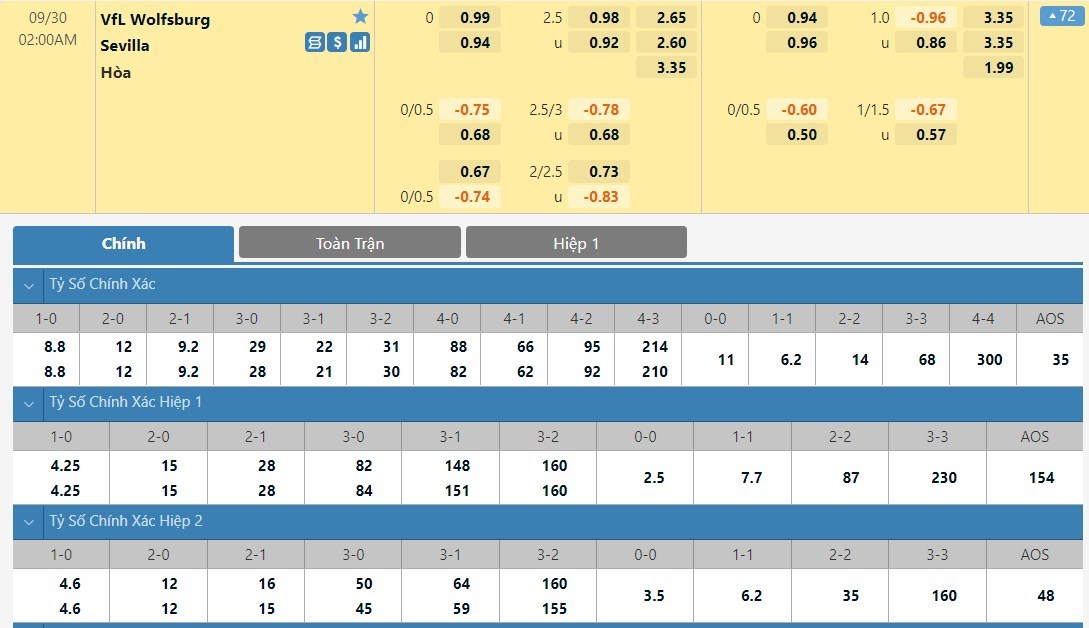 Tỷ lệ kèo cá cược bóng đá trực tuyến trận Wolfsburg vs Sevilla