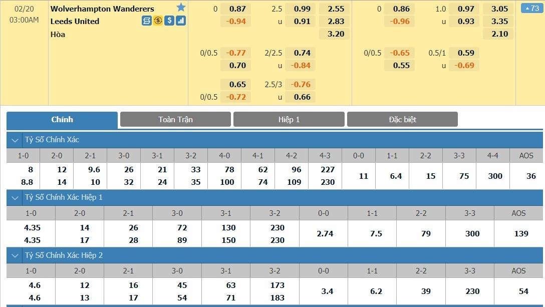 Xem tỷ lệ kèo cá cược bóng đá trực tuyến Wolverhampton vs Leeds United
