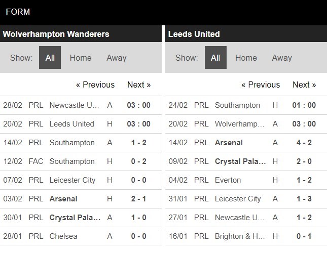 Thống kê phong độ Wolverhampton vs Leeds United