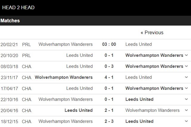 Thống kê đối đầu Wolverhampton vs Leeds United