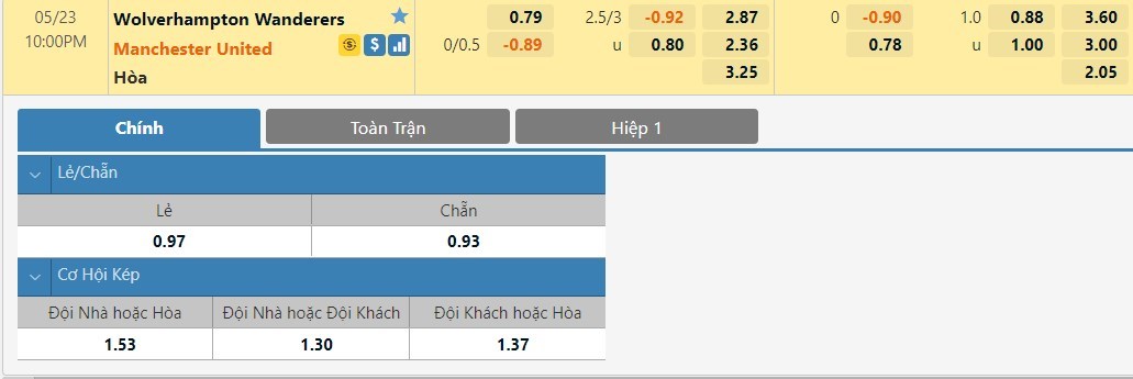 Tỷ lệ kèo cá cược bóng đá trực tuyến trận Wolverhampton vs Manchester United
