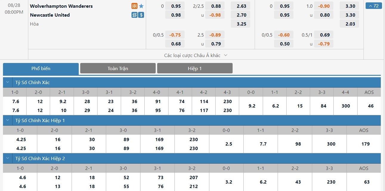 Xem tỷ lệ kèo cá cược bóng đá trực tuyến Wolverhampton vs Newcastle