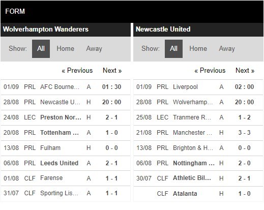 Thống kê phong độ Wolverhampton vs Newcastle