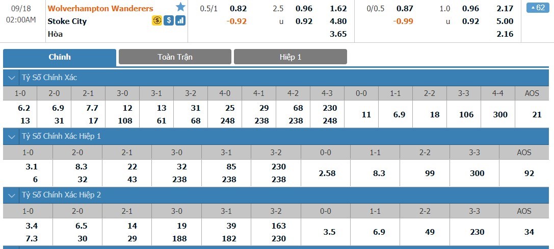 Xem tỷ lệ kèo cá cược bóng đá trực tuyến Wolverhampton vs Stoke City
