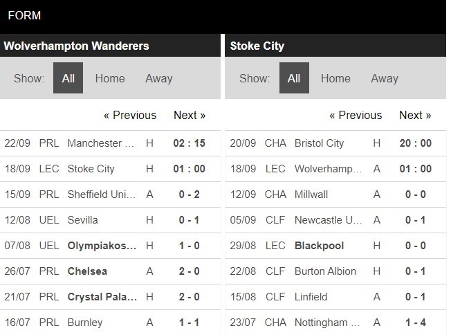Thống kê phong độ Wolverhampton vs Stoke City