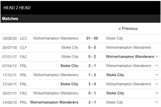Thống kê đối đầu Wolverhampton vs Stoke City