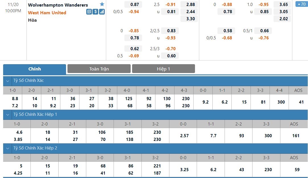Tỷ lệ kèo cá cược bóng đá trực tuyến trận Wolverhampton vs West Ham United