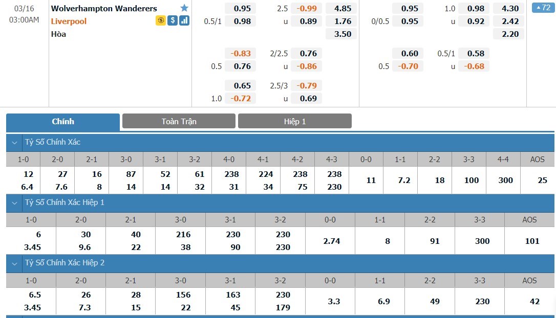 Xem tỷ lệ kèo cá cược bóng đá trực tuyến Wolves vs Liverpool