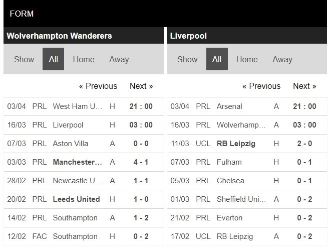 Thống kê phong độ Wolves vs Liverpool