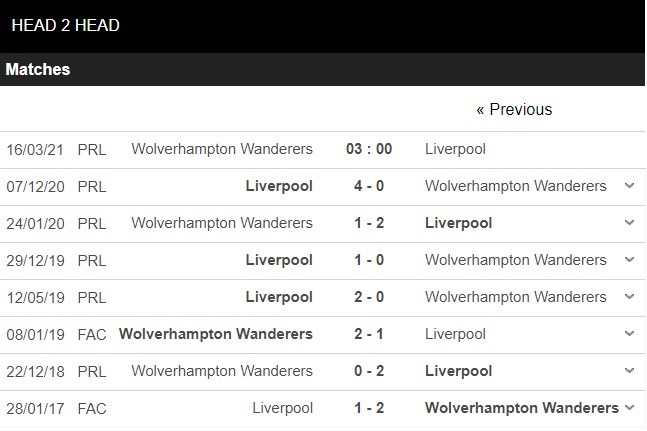 Thống kê đối đầu Wolves vs Liverpool