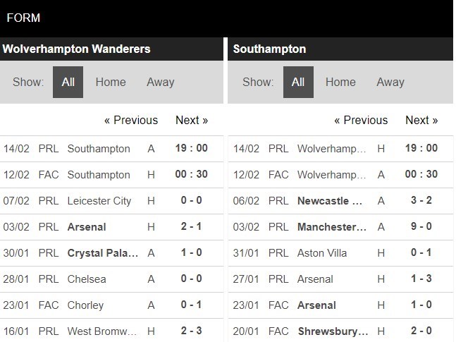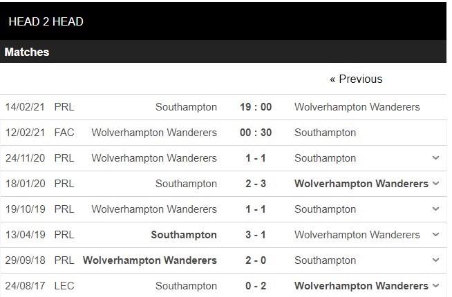 5 lần đụng độ gần đây nhất giữa 2 đội, Wolves thắng 2, hòa 2 và thua 1 trước Southampton. Phong độ của Wolves đang được cải thiện khi mà có liên tiếp 2 trận bất bại trước các đối thủ mạnh và đều tại sân nhà. Trong khi đó, Southampton toàn thua cả 5 vòng vừa qua cũng như chưa thắng tại Molineux kể từ 2007 tới giờ. Chủ nhà khả năng cao sẽ nối dài mạch thắng. Hàng thủ của Southampton nhận tới 16 bàn thua trong 4 trận trước đó nên đây chính là điểm yếu mà chủ nhà Wolves sẽ tập trung khai thác.