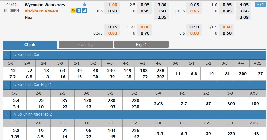 Xem tỉ lệ kèo cá cược bóng đá trực tuyến Wycombe vs Blackburn