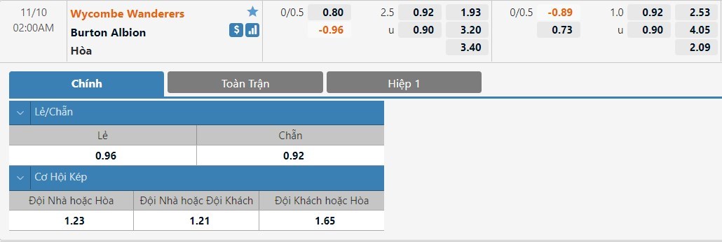 Tỷ lệ kèo cá cược bóng đá trực tuyến trận Wycombe vs Burton