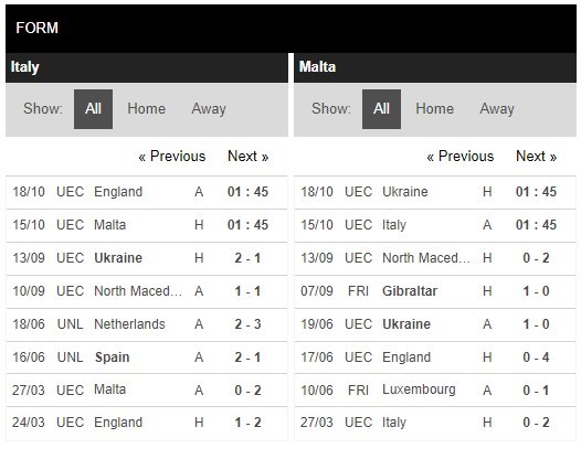 Thống kê phong độ Ý vs Malta