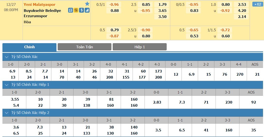 Tỷ lệ kèo cá cược bóng đá trận Yeni Malatyaspor vs Erzurum BB