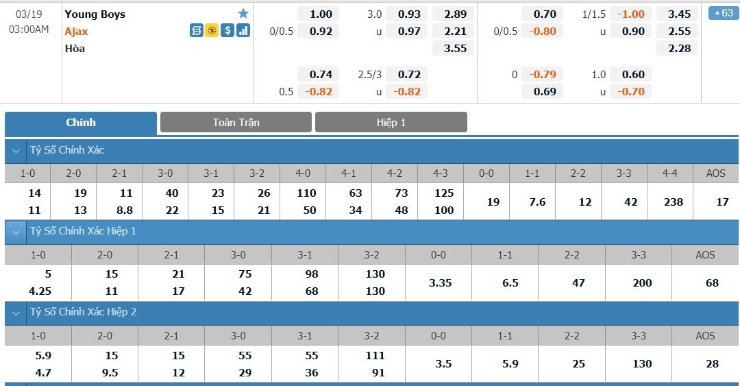 Tỷ lệ kèo cá cược bóng đá trận Young Boys vs Ajax
