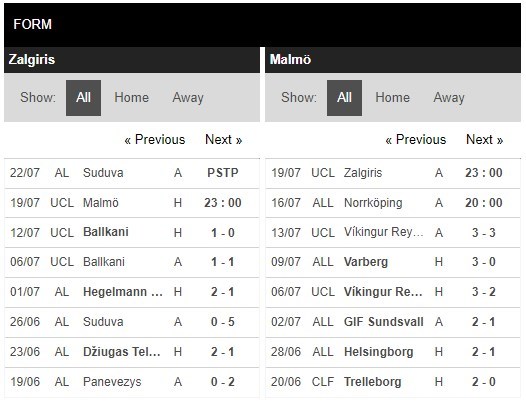 Trong 5 trận đấu gần nhất trên mọi đấu trường, Zalgiris đã sở hữu cho mình 10 pha lập công cùng với 3 lần phải vào lưới nhặt bóng. Bên kia chiến tuyến, Malmo FF đã sở hữu 12 bàn thắng, còn lại là việc hàng thủ đã phải nhận 8 bàn thua. Các chuyên gia cũng đang tin tưởng vào khả năng ra cửa Tài ở cuộc đối đầu này.