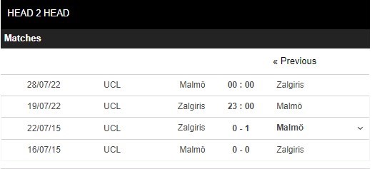 Thống kê đối đầu Zalgiris vs Malmo FF